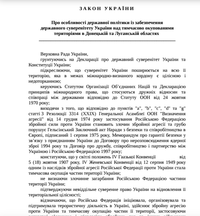 Правовой статус временно оккупированных территорий в Донецкой и Луганской областях определяется этим законом и общепризнанными принципами международного права.