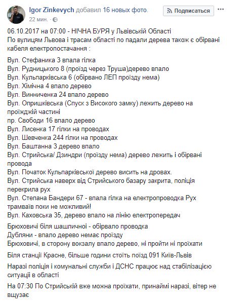 "По улицам Львова и трассам области попадали деревья, также оборваны кабеля электроснабжения", — написал Зинкевич.