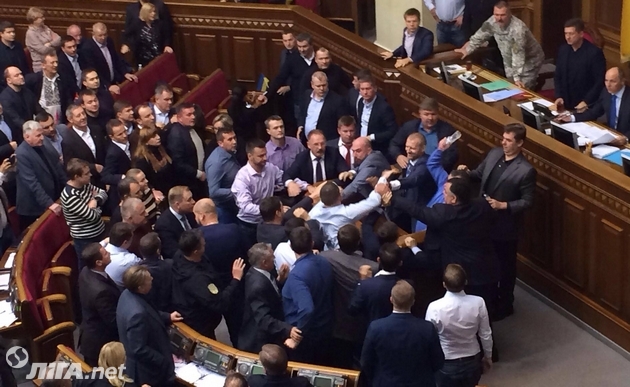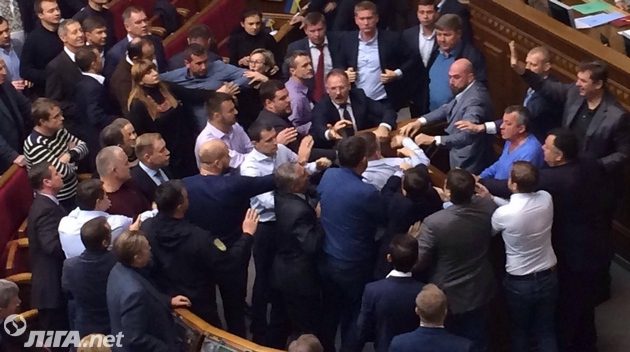 Перед голосованием депутаты Игорь Луценко и Юрий Левченко устроили потасовку возле парламентской трибуны.