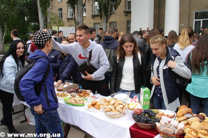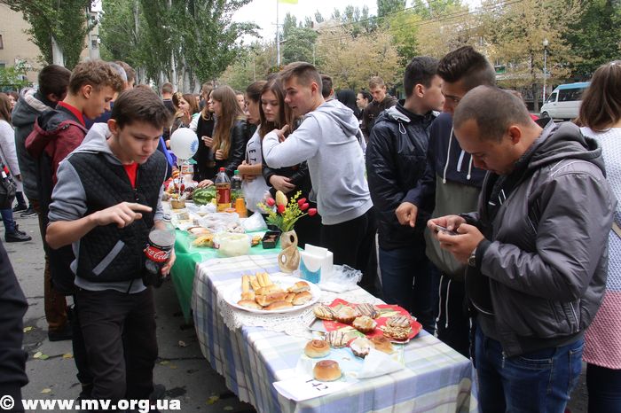 Во-вторых, тут же, прямо на тротуаре студенты организовали ярмарку. Продавали соки и воду, горячие напитки, а также разные вкусности - булочки, пирожки и тортики. А чтобы было не так холодно, студенты устроили на улице танцы.
