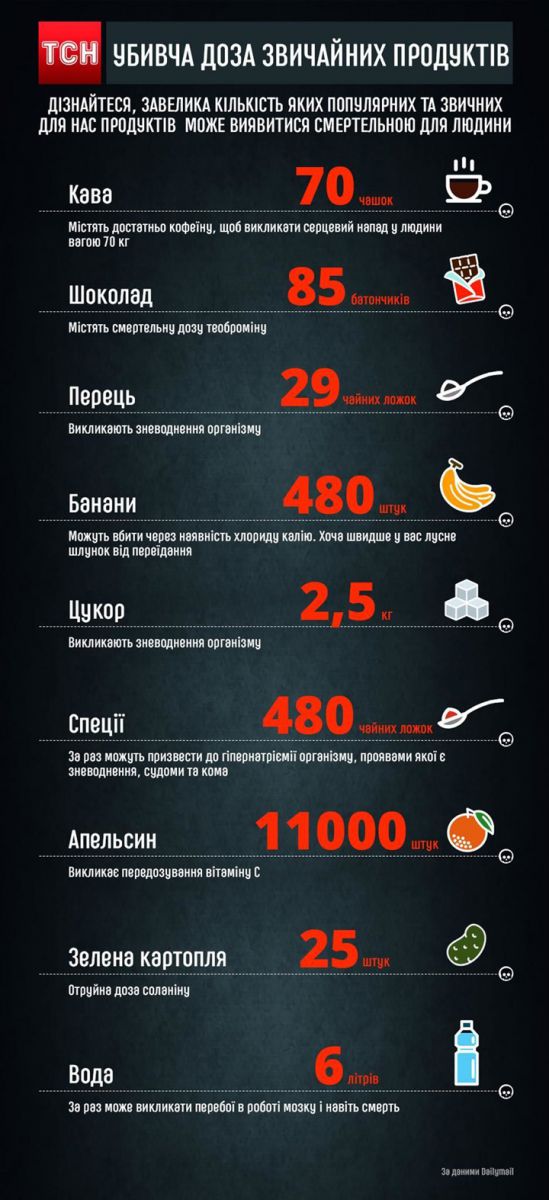 Опубликован список продуктов питания, большая доза которых может стать смертельной для человека. Например, 6 литров воды, выпитые за раз, могут привести к нарушениям в работе мозга, а 70 чашек кофе, скорее всего, вызовут сердечный приступ.