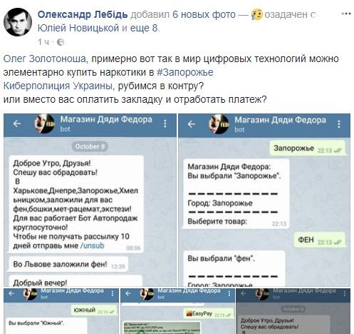 Запорожец Александр Лебедь поделился в сети скринами переписки с продавцами наркотиков и просит главного полицейского области Олега Золотоношу отреагировать на деятельность этого магазина.