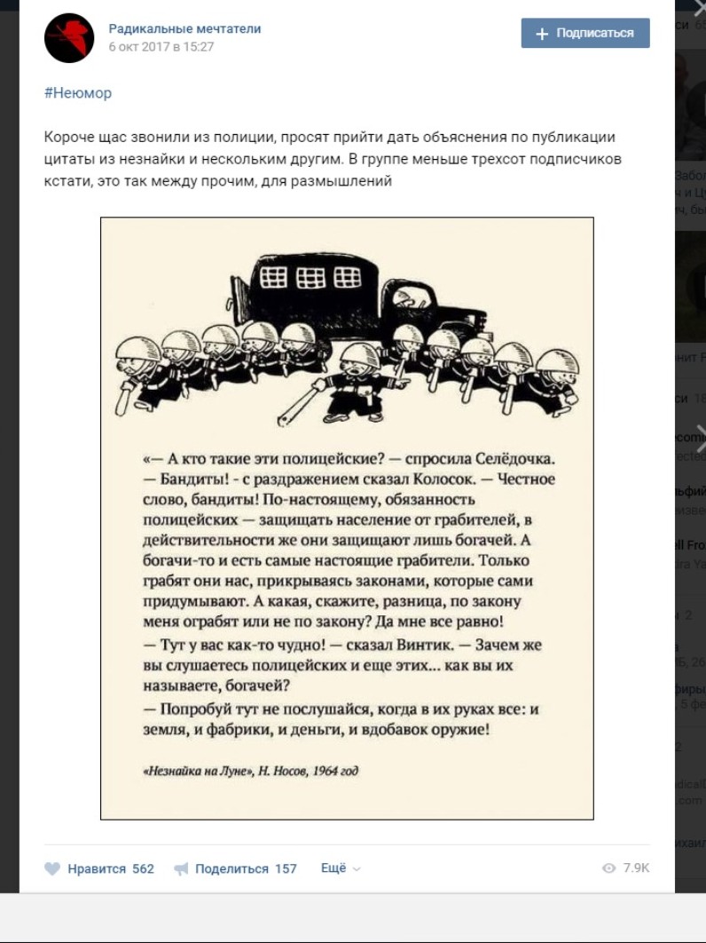 «Короче, щас звонили из полиции, просят прийти дать объяснения по публикации цитаты из незнайки и нескольким другим. В группе меньше трехсот подписчиков, кстати, это так, между прочим, для размышлений», — говорится на странице «Радикальных мечтателей».
