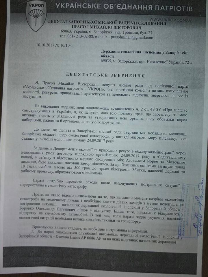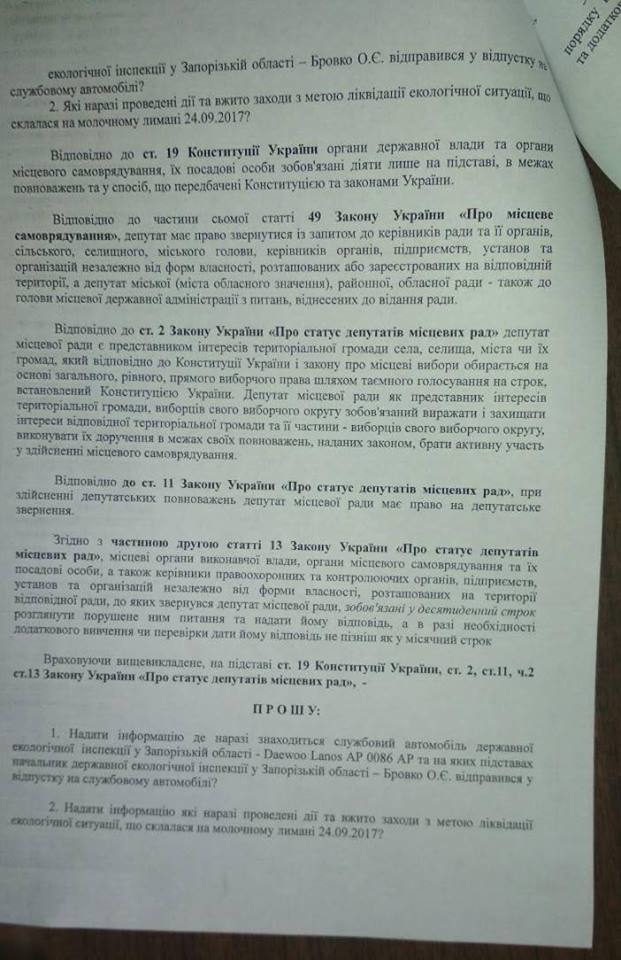 В экологическую инспекции депутатом горсовета Михаилом Прасолом сегодня был отправлено обращение с просьбой предоставить информацию, где находится служебный автомобиль DAEWOO LANOS АР 0086 АР, а также какие действия экологической инспекцией области были проведены в связи с замором рыбы в Молочном лимане.