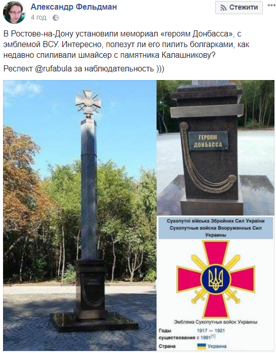 "В Ростове-на-Дону установили мемориал "героям Донбасса", с эмблемой ВСУ. Интересно, полезут ли его пилить болгарками, как недавно спиливали шмайсер с памятника Калашникову?", - написал он.