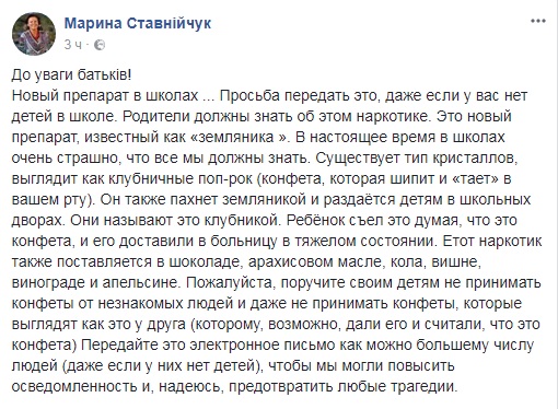 "Это новый препарат, известный как "клубника". В настоящее время в школах очень страшно, что все мы должны знать. Существует тип кристаллов, выглядит как клубничные поп-рок (конфета, которая шипит и "тает" в вашем рту). Он также пахнет земляникой и раздается детям на школьных дворах. Они называют это клубникой. Ребенок съел это, думая, что конфета, и его доставили в больницу в тяжелом состоянии", - написала автор.