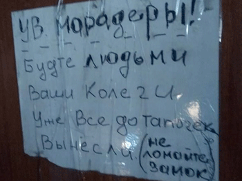 "Уважаемые мародеры! Будьте людьми. Ваши коллеги уже все до тапочек вынесли. Не ломайте замок", – говорится в объявлении, размещенном на двери здания.