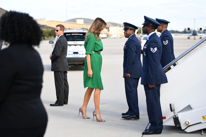 Наряд, стоимостью 450 долларов, дополнили яркие лодочки от Christian Louboutin. Мелания изумила стройными ножками.