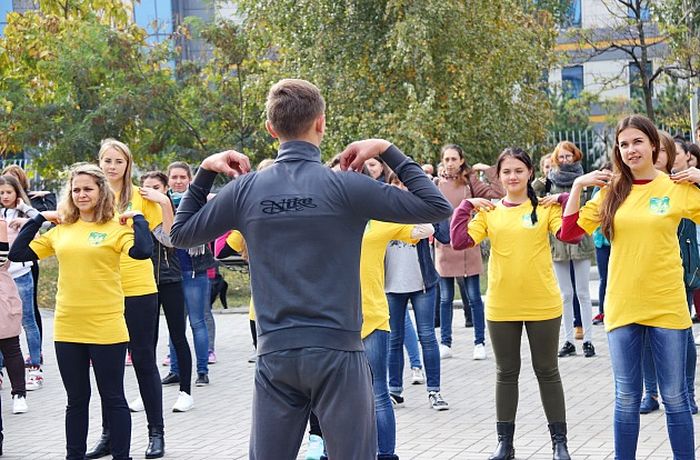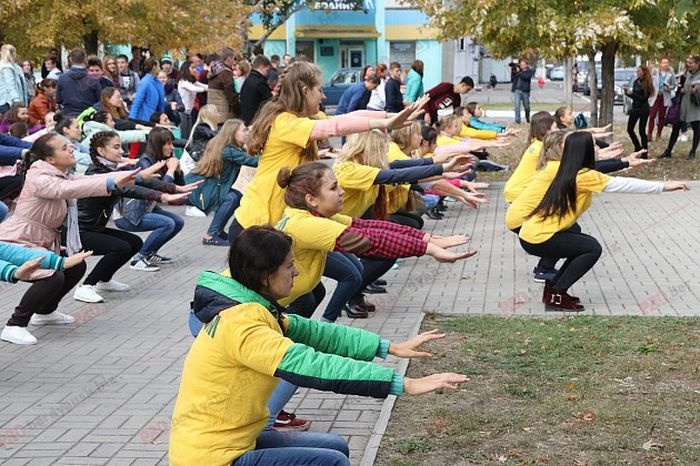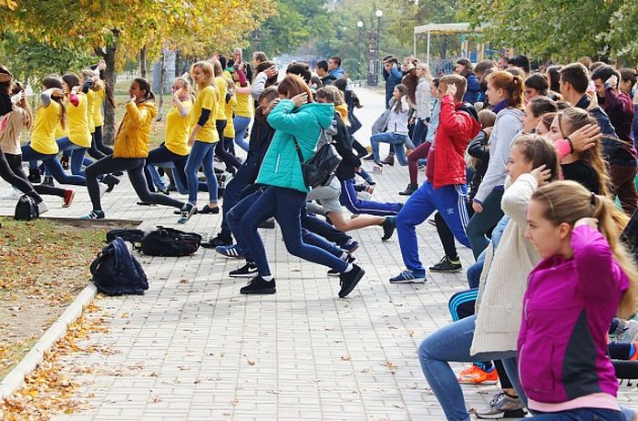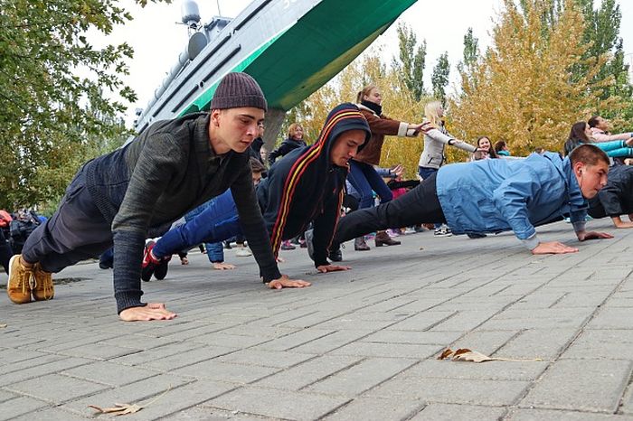 Студенты педагогического университета подошли к поздравлению защитников Украины с выдумкой. Всем мужчинам страны они посвятили спортивную акцию, во время которой юноши отжимались, а девушки приседали. После разминки участники акции в целом сделали 2200 приседаний и отжиманий.