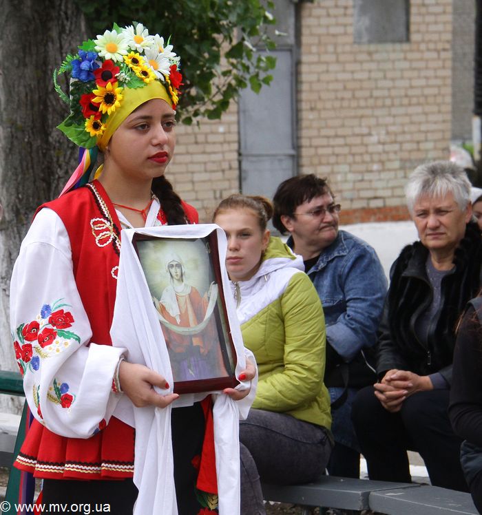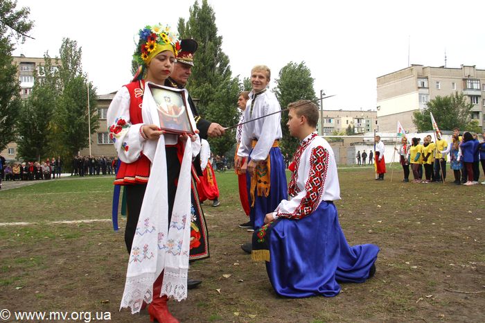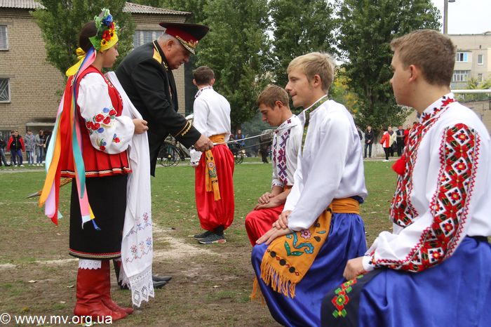 Настал торжественный миг посвящения молодежи в казаки. Этот обряд провел генерал-майор Украинского реестрового казачества В. Еременко: настоящая сабля и икона Богородицы дотронулись до каждого молодого казака.