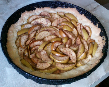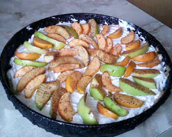 5. Сверху выложить яблоки, укладывать их плотно друг к другу. Форму отправить в духовку на полчаса.