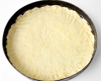 4. Разогреть духовку до 175 градусов. Форму с бортиками (желательно разъемную) смазать маргарином или сливочным маслом. Тесто достать из холодильника и выложить в форму, разровнять руками. Сформировать невысокие бортики из теста.