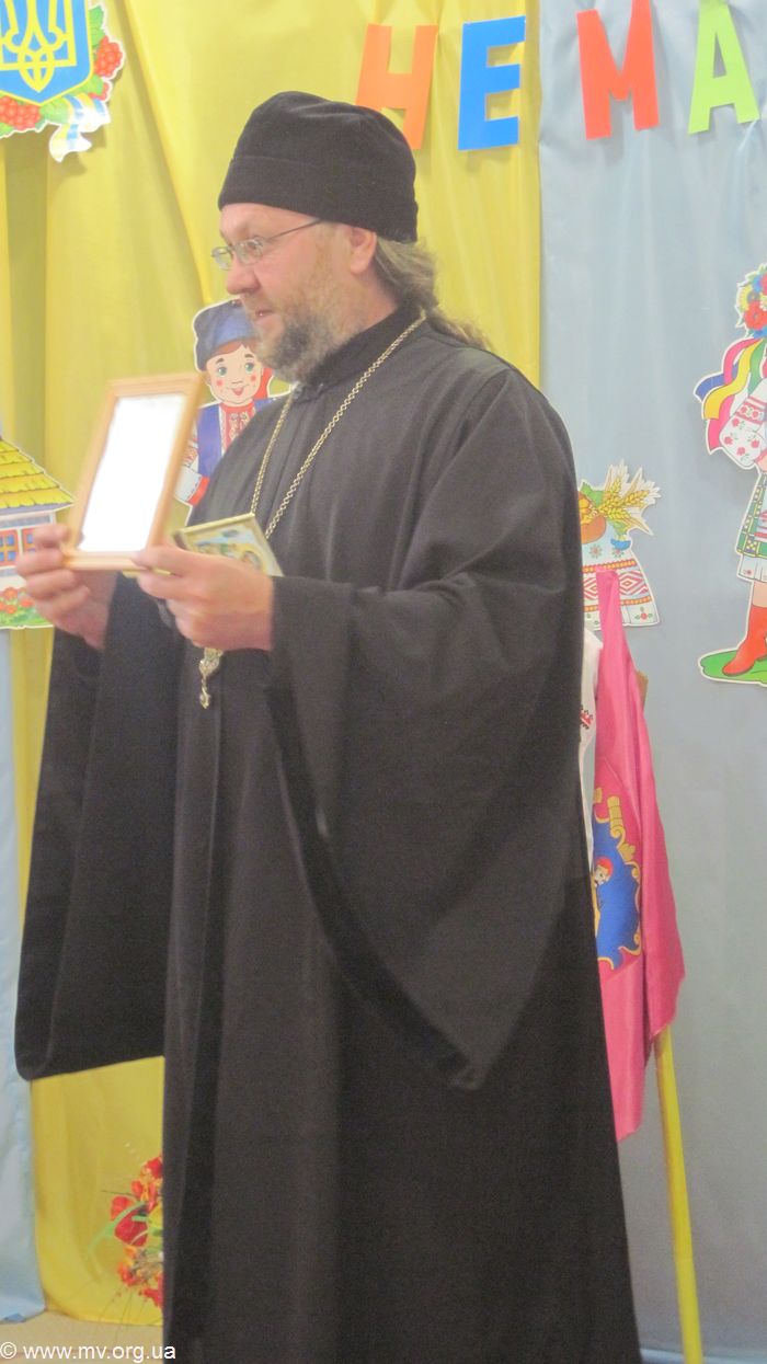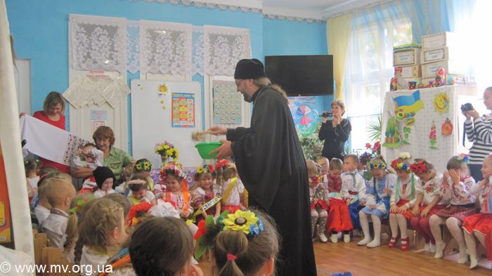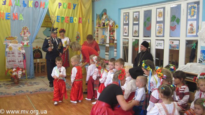 На праздник был приглашены казак Михаил Хохлов из районного Мелитопольского куренного полка и настоятель храма в честь иконы Казанской Пресвятой Богородицы игумен Макарий (Шадрин). Ребята и воспитатели читали стихи о казаках, пели песни, играли в казацкие игры – напоить коня, спаси казачку, варили кулиш, танцевали задорные танцы. В конце праздника Михаил Геннадиевич посвятил 38 ребенка в казачата и берегини, и дети получили в подарок памятные подковы и маленькие булавы. Батюшка поздравил ребят с знаменательным событием в их жизни, благословил, подарил иконы и напомнил, что когда тяжело, нужно обращаться за помощью к Божьей Матери, так как это делали запорожские казаки.
