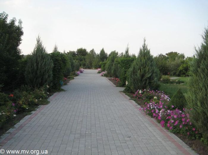 В восточной части расположен участок хвойных деревьев - там растут пушистые крымские сосны. Когда я впервые все это увидел, мне показалось, что это Никитский ботанический сад в миниатюре! По территории парка причудливо изгибаются дорожки, выложенные плиткой, а в центре - искусственный пруд с небольшим водопадом в обрамлении березок, елей и цветочного ковра. В пруду живут рыбки, вода постоянно обновляется. По центральной аллее установлены скамейки, укрытые от солнца переплетенными ветвями кустарников. Трудно поверить, что за пределами этого чуда, буквально в нескольких десятках метров под палящим солнцем раскинулись поля!