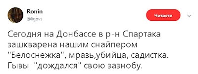 "Сегодня на Донбассе в р-н Спартака зашкварена нашим снайпером "Белоснежка", мразь, убийца, садистка. Гывы "дождался" свою зазнобу", - сказано в сообщении.