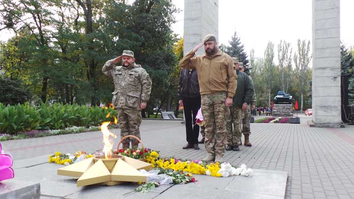 - От имени всех ребят, кто не смог сегодня прийти к памятнику, от Союза ветеранов АТО, ОО "Побратим" мы отдаем дань уважения и благодарим всех, кто ценой жизни защищал родную землю в той войне, кто боролся с фашистскими захватчиками. Сейчас сложилась похожая ситуация - на Украину посягают те, кто еще недавно считался братьями. И мы оглядываемся на воинов Второй мировой, думаем, как бы они поступили в той или иной ситуации. Понимаем, что и они, и мы выполняем, как говорит наш комбат, главное предназначение мужчины - защиту своего дома, - говорит военнослужащий 37 отдельного мотопехотного батальона Алексей Петров.