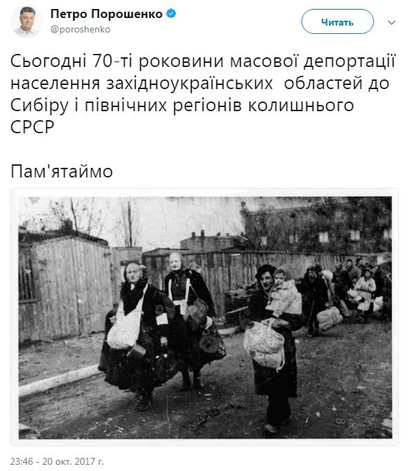 Президент Петр Порошенко в своем твитте от 21 октября о годовщине массовой депортации западных регионов Украины в Сибирь прикрепил фото депортации нацистами евреев в лагерь смерти в 1942 году. Ошибку заметил директор Украинского еврейского комитета Эдуард Долинский, о чем и написал в Facebook.