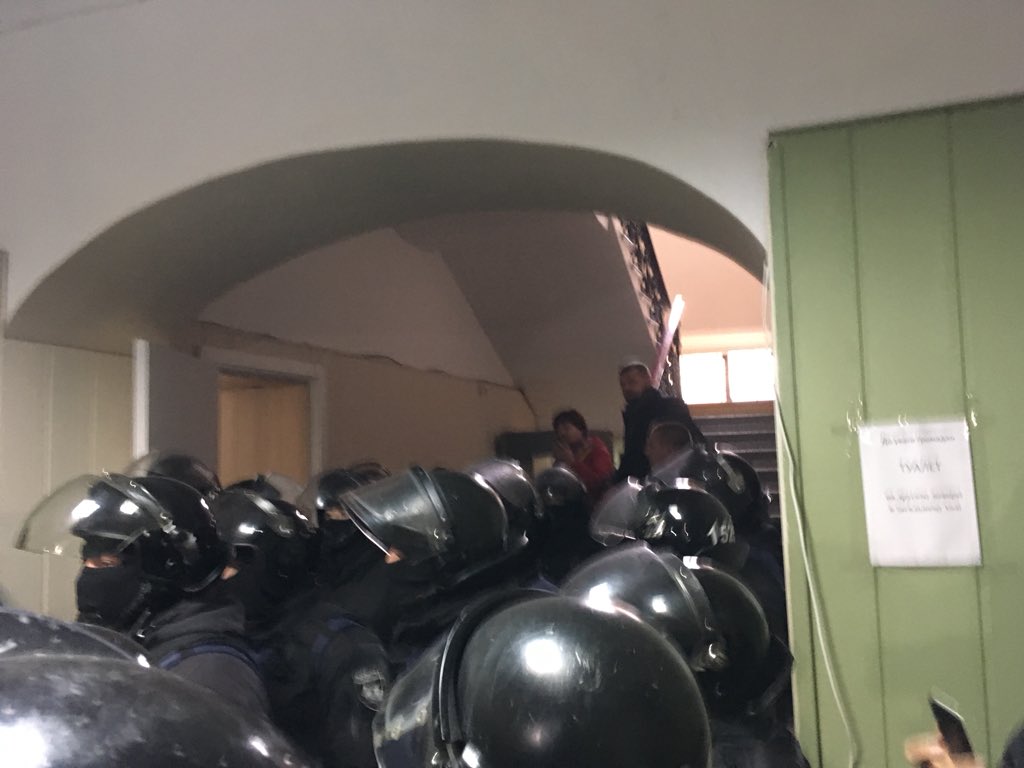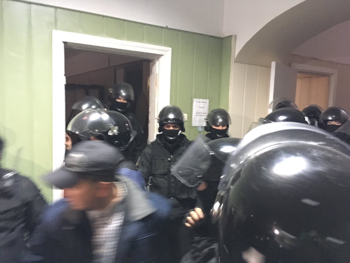 На видео видно, что полицейские в защитной экипировке силой пробиваются в здание суда. В ходе штурма нескольких человек силой выводят из помещения.