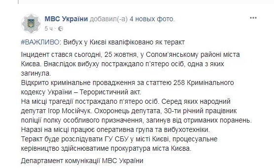 "Инцидент произошел 25 октября в Соломенском районе города Киева. В результате взрыва пострадали пять человек, один из которых погиб. Открыто уголовное производство по статье 258 Уголовного кодекса Украины — террористический акт", — говорится в сообщении ведомства.