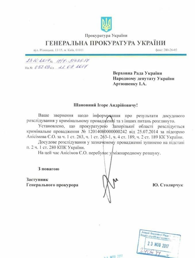 Запорожский народный депутат Игорь Артюшенко сделал запрос в Генеральную прокуратуру Украины.