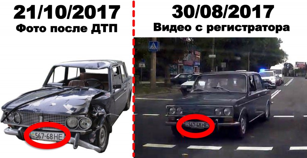 На записи видно, как тот же автомобиль (марка и госномер идентичны), грубо нарушая правила, объезжая остановившиеся на светофоре машины, выезжает на встречную полосу и проскакивает на красный сигнал.