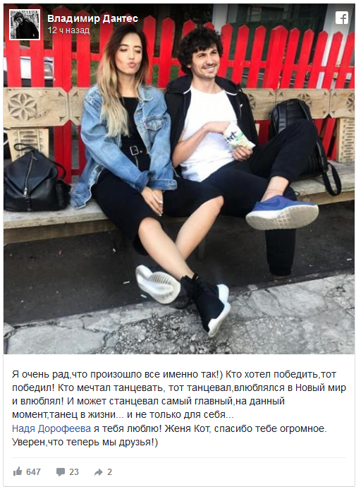 Надя Дорофеева я тебя люблю! Женя Кот, спасибо тебе огромное. Уверен, что теперь мы друзья!)", - отметил Владимир.