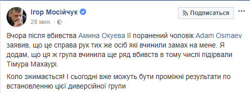 Раненный в результате теракта нардеп-радикал Игорь Мосийчук назвал убийство Амины Окуевой, Тимура Махаури и покушение на него делом рук одной диверсионной группы. Об этом он написал в Facebook.