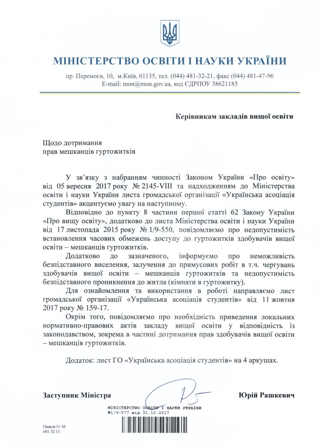 В сообщении говорится, что действующими законами Украины не предусмотрено какие-либо ограничения в отношении пользования студентами жильем в общежитиях в определенное время суток.