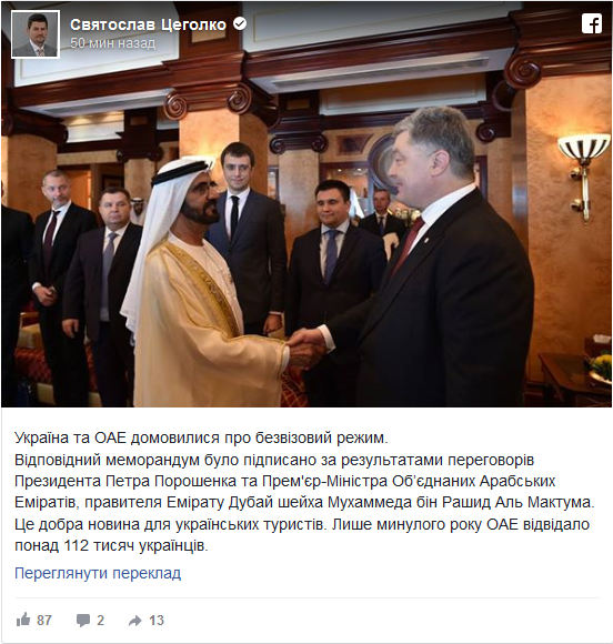 "Соответствующий меморандум был подписан по итогам переговоров президента Петра Порошенко и премьер-министра Объединенных Арабских Эмиратов, правителя Эмирата Дубай шейха Мухаммеда бин Рашид Аль Мактума. Это хорошая новость для украинских туристов. Только в прошлом году ОАЭ посетили более 112 тысяч украинцев", - отметил Цеголко.