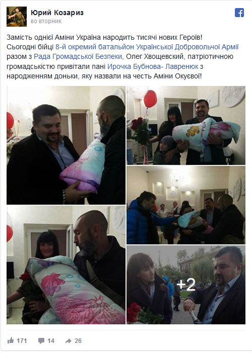 По его словам, девочку родила Ирина Бубнова-Лавренюк. Поздравить с рождением дочери пришли бойцы 8-го отдельного батальона Украинской добровольческой армии вместе с Советом общественной безопасности и патриотической общественностью.