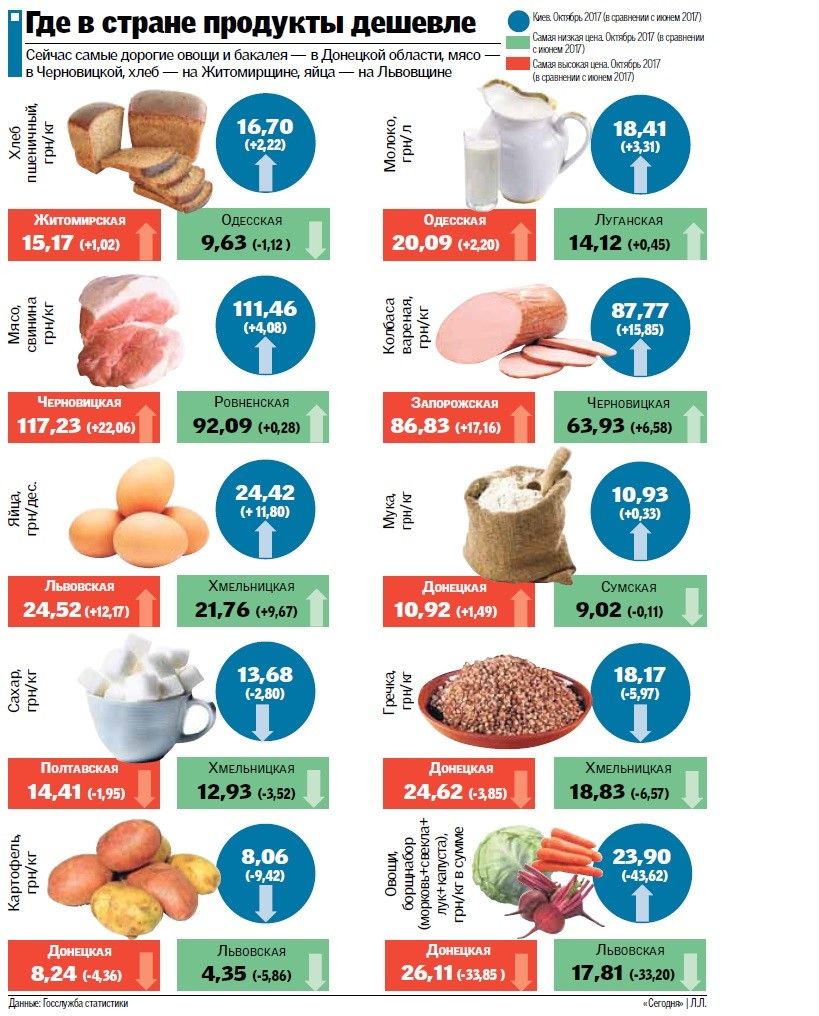 Самый большой набор дешевых продуктов — на Хмельнитчине, это яйца, картофель, сахар, хотя цены на эти продукты там ниже всего на 30—50 коп./кг по сравнению с другими областями. Киев может похвастаться самой дешевой гречкой — всего по 18,17 грн/кг (–5,97 грн/кг или на 33%). Кстати, год назад в столице кило гречки стоило 38 (!) грн/кг, это был рекорд.