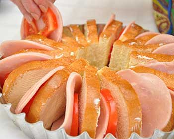 4. Между ломтиками батона положить дольки помидоров и ветчины.