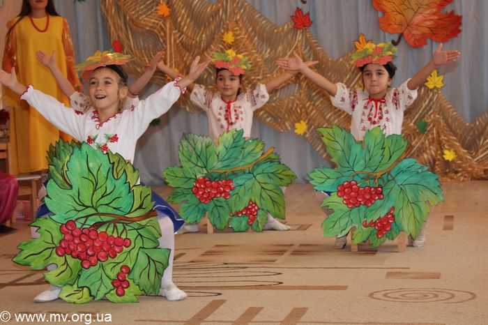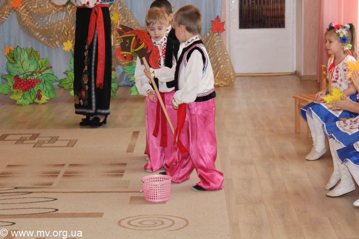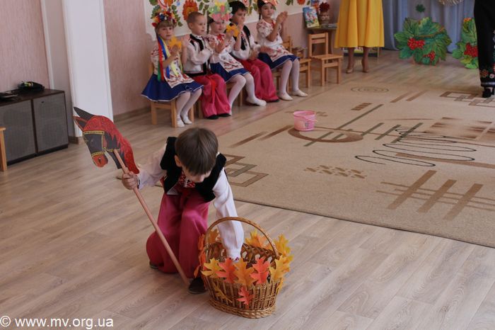 Естественно, проходило мероприятие на украинском языке. Но ребята не только пели песни и рассказывали, но и вспоминали поговорки и украинские символы. Чтобы праздник был веселей, его посетили гости. И первой пришла красавица Осень, которая забрала детсадовцев на Запорожскую сечь. Здесь маленькие казачата пели песни и танцевали со шпагами. А девочки-"калиноньки" также подарили присутствующим танец. Ну и какой же может быть казак без своего бравого коня. На празднике казачата на лошадках переносили урожай. И если в других садиках в таких конкурсах участвуют только мальчишки, то в "Радуге" на лошадях прокатиться предложили и девочкам. А те с радостью согласились.