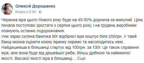 Красная икра в этот Новый год будет на 45 – 50% дороже, чем в прошлом. Цена начала постепенно расти с августа этого года, и в декабре производители планируют последнее подорожание", – написал Дорошенко на своей официальной странице в Facebook.