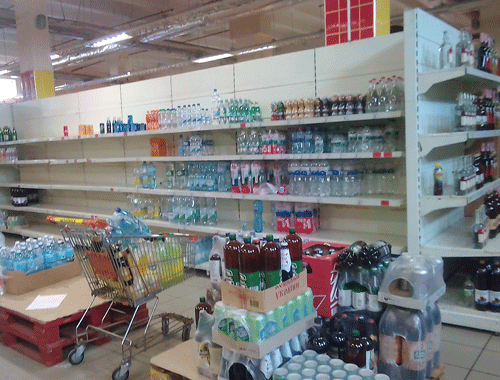 Оставшийся в супермаркете товар перенесен на полки ближе к выходу. В глубине помещения полки и стеллажи уже разбирают. Напомним, что завтра супермаркет «Фуршет» будет закрыт.