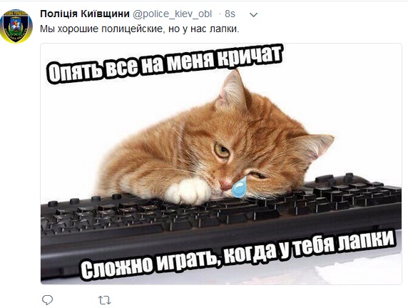 Неизвестные "злоумышленники" тонко посмеялись над полицией Киевской области. Twitter-аккаунт областного управления правоохранителей вчера был взломан. В аккаунте полицейских была размещена картинка с котиком, который не может работать, потому что ему мешают лапки. Таким образом шутники решили намекнуть на недостаточно эффективную работу полиции.