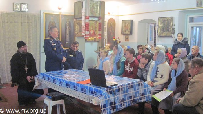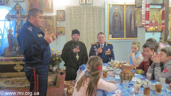 На мероприятие были приглашены казаки районного Мелитопольского куренного полка атаман Александр Литвин и старейшина Геннадий Хохлов. В литературном вечере ребята воскресной школы читали «Повествование о жизни Петра Калнышевского» Ларисы Комиссар, прихожанки храма в честь святых Петра и Февроньи в г.Запорожье. Гости и прихожане храма с удовольствием посмотрели документальный фильм «Петр Калнышевский». Батюшка рассказал об автопробеге на Соловки, в котором он принимал участие вместе с Запорожской епархией в 2015году. Соловецкий монастырь – это место пожизненной ссылки и кончины последнего атамана Запорожской Сечи. Во время рассказа использовался видеофильм «Соловки», созданный по фото и видеоматериалам отца Макария. Закончился вечер дружным чаепитием, после ответов на тесты о Петре Калнышевском.