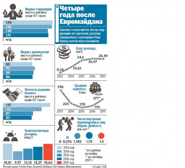 Сегодня — четыре года Евромайдану, открывшему новую страницу в истории Украины. "Сегодня" оценила, как изменилась страна за эти годы политически и экономически.