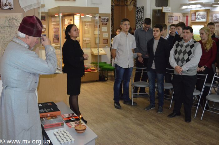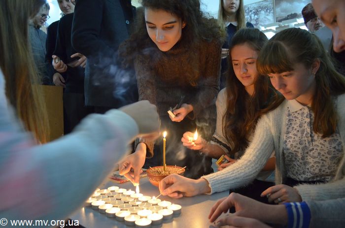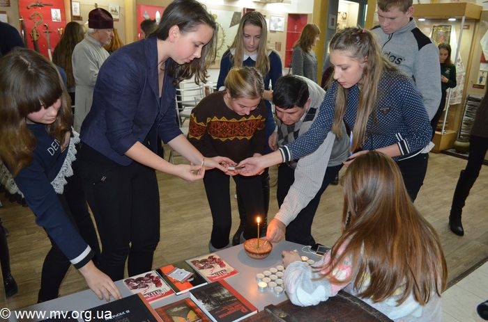 Гимназисты и их педагоги ознакомились с предметами быта, украинскими рушниками 20-30 - х гг., тематической выставкой "Страницами книг о Голодоморе", которая развернута в окне-витрине музея. Память жертв Голодомора все собравшиеся почтили минутой молчания и зажженными свечами.