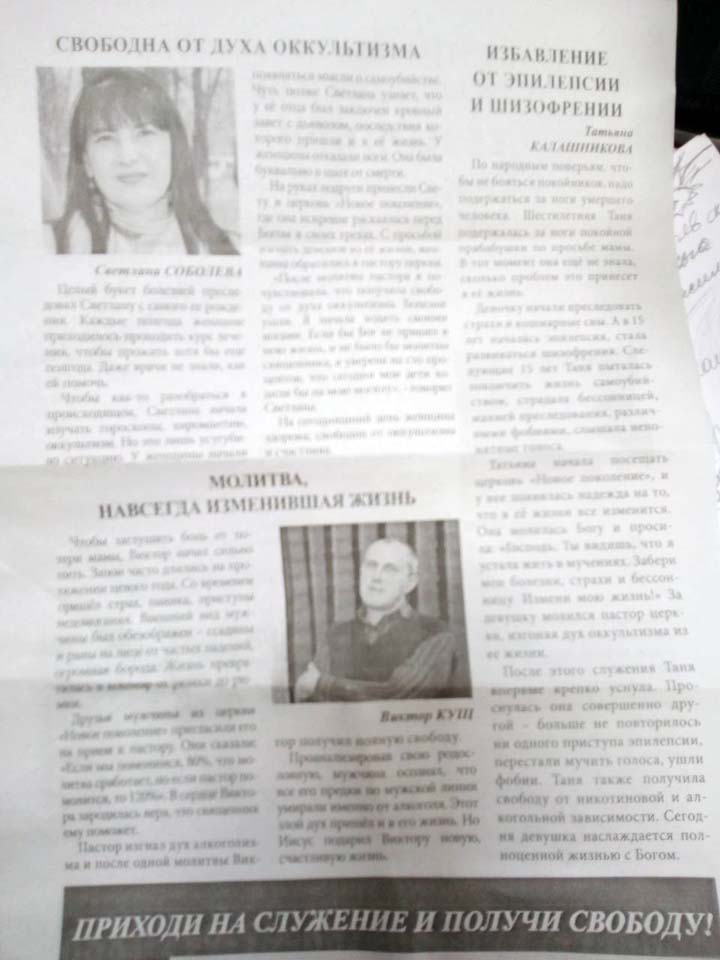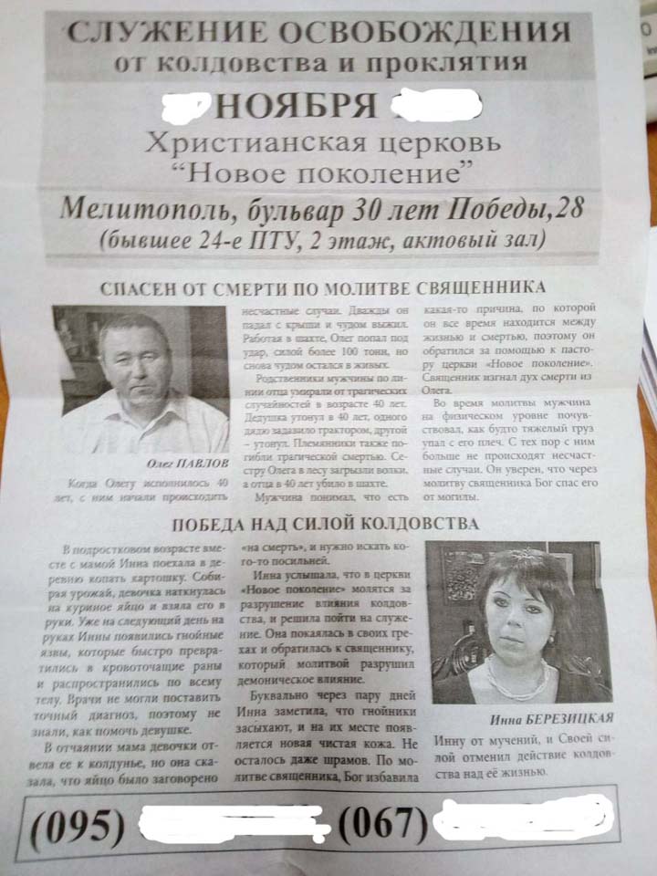 Именно такие истории, как будто рассказанные малограмотными и "забобонными" бабками, размещены на листовках, приглашающих горожан на "Служение освобождения от колдовства и проклятия".