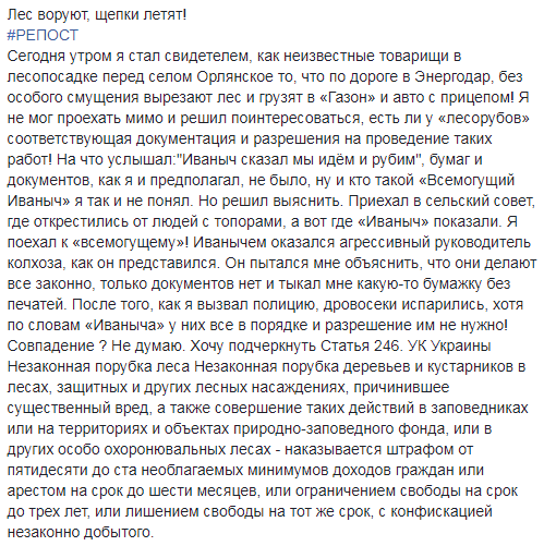 Запорожский общественник зафиксировал факт незаконной вырубки леса.