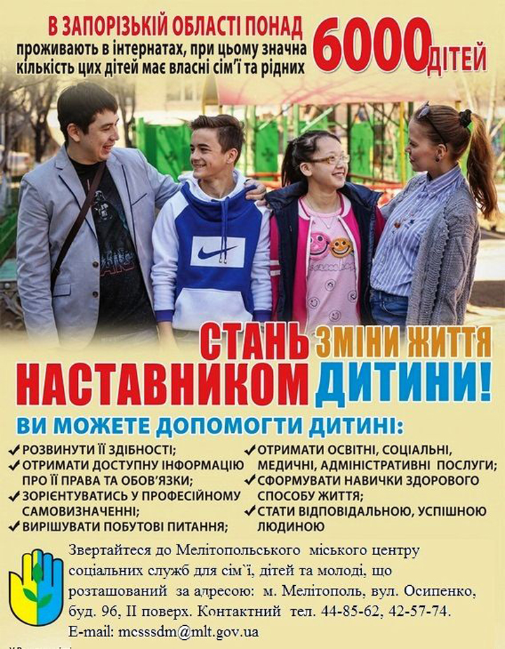 Подробнее о том, как можно стать наставником, расскажут в Мелитопольском городском центре социальных служб для семьи, детей и молодежи, который расположен по адресу: г. Мелитополь, ул. Осипенко, 96, II этаж. Контактный тел. 44-85-62.
