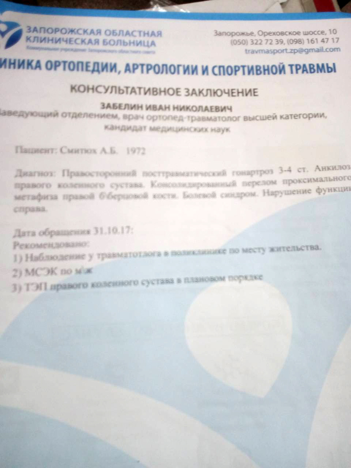 - Травму я получил, когда работал водителем автобуса в Запорожье. Попал в аварию. Были операции, но сейчас медики поставили диагноз "Правосторонний посттравматический гоноартроз 3-4 ст. Анкилоз правого коленного сустава. Консолидированный перелом проксимального метафиза правой берцовой кости. Болевой синдром, нарушение функций", - рассказывает мужчина.