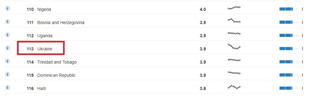 Украина в этом рейтинге расположилась между Угандой и Тринидадом и Тобаго.