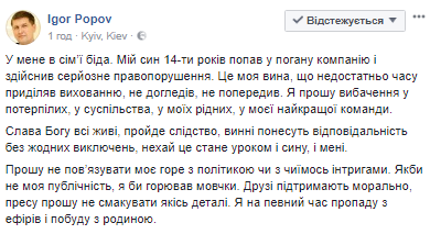 "У мeня в семье беда. Мой сын 14-ти лет попал в плохую компанию и совершил серьезное правонарушение. Это моя вина, что недостаточно времени уделял воспитанию, недосмотрел, не предупредил. Я прошу прощения у потерпевших, у общества, у моих родных, у моей лучшей команды", - написал он.