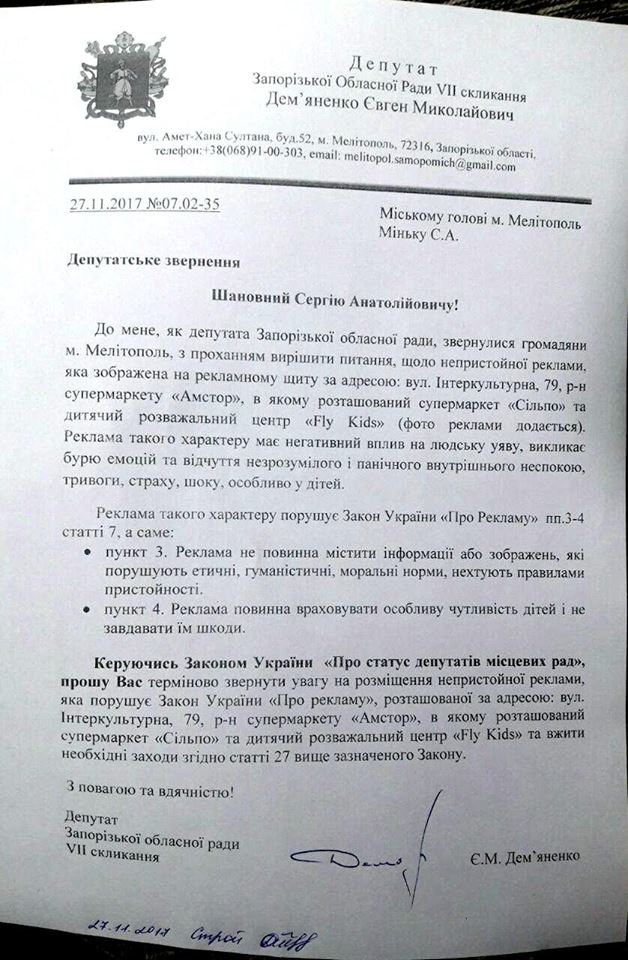 "До мене звернулися мешканці нашого міста, які відвідують з маленькими дітьми дитячий розважальний центр «FLY KIDS», з проханням допомогти в вирішенні питання щодо розміщення непристойної реклами на рекламному щиту (фірми «Браво»), розташованого біля дитячого центру та супермаркету.