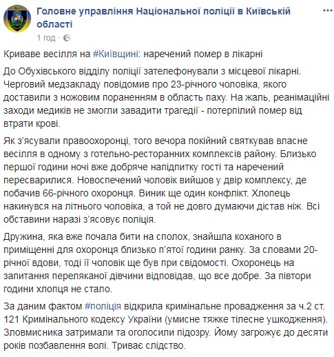 В Киевской области охранник одного из гостинично-ресторанных комплексов убил мужчину, праздновавшего свою свадьбу. Об этом сообщает пресс-служба Главного управления Национальной полиции в Киевской области на своей странице в Facebook.