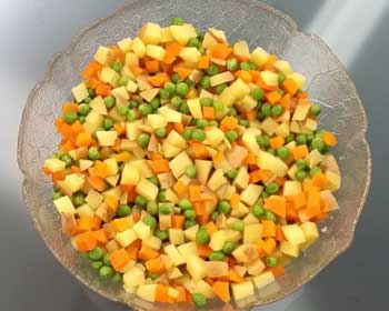 1. Отварить картофель и морковь в мундирах, очистить и нарезать мелкими кубиками.
