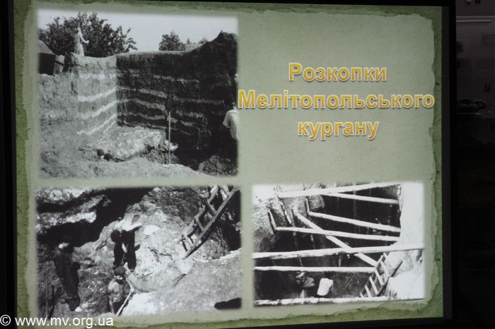 Иторико-краеведческий музейный дискурс подготовили и провели научные сотрудники МКМ Наталья Твердохлеб и Анна Лиходед. Они рассказали гимназистам о полной приключений и удивительных открытий, научной и исследовательской работы жизни заслуженного деятеля науки УССР, лауреата Государственной премии, доктора исторических наук, профессора А. Тереножкина, который в 1954 г. провел раскопки Мелитопольского "царского" кургана, обнаруженного местным жителем на ул. Первомайской (теперь Скифской). Он родился 26 ноября 1907 года в городе Николаевске (Пугачеве, Саратовская обл.) в семье владельца букинистической лавки и крестьянки. Алексей учился в церковно-приходской школе и был членом кружка краеведения при музее. В фондах Пугачевского краеведческого музея сохранились сведения о первых находках А. Тереножкина, которые он принес в музей, когда ему было 13 лет. Это череп древнего человека, подобранный им в 1920 году на берегу реки Иргиз.