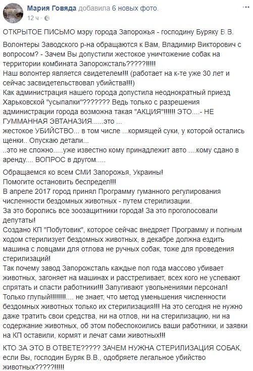 На территории комбината «Запорожсталь» жестоко уничтожают собак. За животными ухаживают сотрудники предприятия, многие собаки чипованы и стерилизованы.